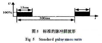 電磁兼容設計靠電磁兼容試驗來驗證與改進。現在,有了比較完善的電磁兼容試驗方法和專門的試驗設備。開關電器動作時,形成強烈的干擾,產生瞬態脈沖。IEC61000-4-4標準對電快速瞬變脈沖干擾作出規定,分為單個脈沖、一群脈沖、脈沖群。脈沖群波形如圖5所示,周期為300ms,脈沖束寬度為15ms。