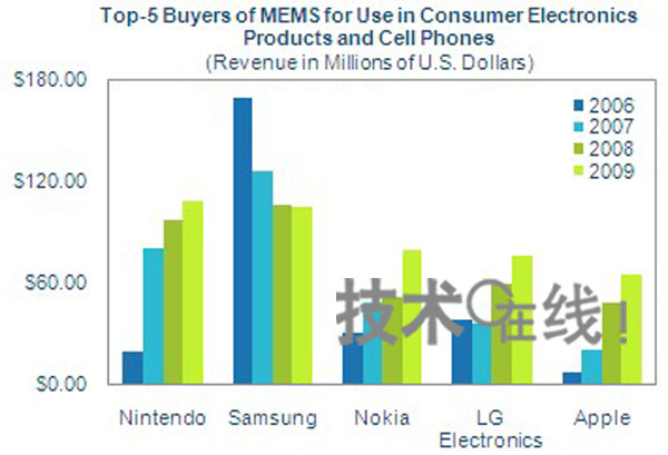 美國iSuppli透露,2009年消費類電子產品與手機MEMS部件的最大買家是任天堂。任天堂在提高游戲機“Wii”遙控器動作識別精度的附件“Wii MotionPlus”中采用了陀螺儀(角速度傳感器),使得MEMS購買額比上年增加11.9%,達到1億800萬美元。超越了此前兩年內一直穩居榜首的韓國三星電子。緊隨其后的是名列第三的芬蘭諾基亞、位居第四的韓國LG電子以及位列第五的美國蘋果公司。