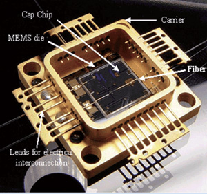 圖3微型光機械系統(MOEMS)交換器件的管芯被4條光纖和連接線連接,并封裝在工業標準的Covar金屬封裝內