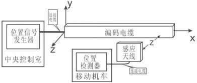 自動控制系統中,必須解決兩個基本問題:a.控制和受控雙方可靠的數據通信;b.移動機車所在位置的位置檢測。感應無線位置檢測系統,將感應無線數據通信和位置檢測融合在一個系統中,它由位置信號發生器、編碼電纜、感應天線、位置檢測器組成。其中感應天線箱安裝在移動機車上隨機車移動,且始終與編碼電纜保持距離z;編碼電纜部分由編碼電纜、連接電纜、匹配阻抗構成。感應無線位置檢測系統框圖如圖1所示。