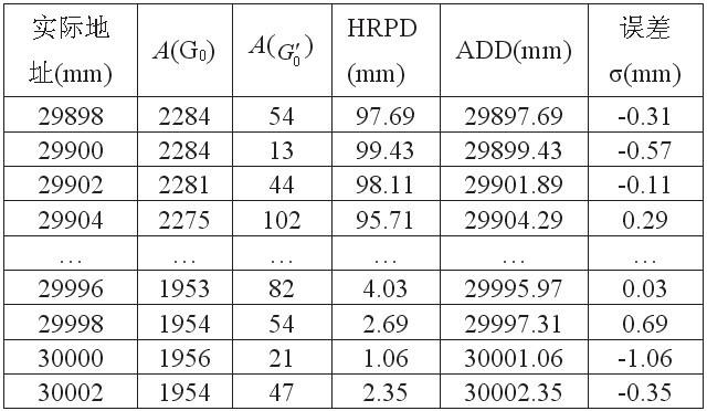 實驗方法:在編碼電纜任找一處反復移動天線箱,直至檢測到A(G''0)為最小,此時顯示地址為29.000m,以此處作為實際的29.000m。然后將天線箱在此附近每隔2mm移動一次,記錄每次所檢測的A(G0)和A(G''0),并根據檢測的數據計算出位置數據:HRPD、ADD。同理,在30.000m處作同樣測試。部分檢測數據和計算結果如表1所示.