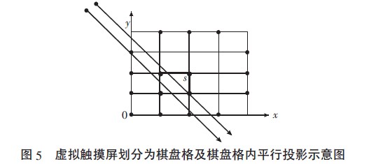 具體實施中,為準確識別手指位置,將虛擬觸摸屏劃分為n×n 的棋盤格,如圖5 所示,由于攝像頭離棋盤格距離較遠,且每個棋盤格足夠小,于是可以假設在棋盤格內,攝像頭拍攝的光線是平行的,以簡化點位置的轉換。