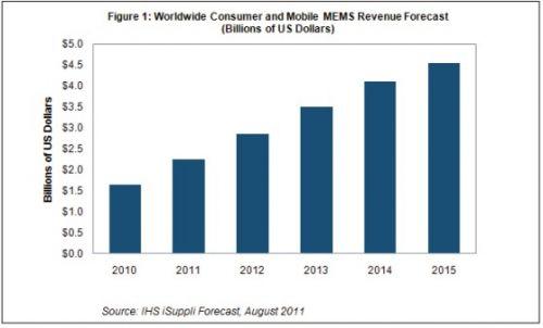 據IHS公司的消費與移動MEMS市場研究報告,微機電系統(MEMS)市場中最大和最有活力的領域是消費與移動器件,通過積極開拓智能手機和平板應用,2011年MEMS市場將再度實現創紀錄的增長率。