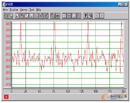在動態(tài)試驗中,保持液壓泵提供20L/min的工作流量,使用Wavebook512信號系統(tǒng)對MEMS傳感器輸出流量信號進(jìn)行采集,如圖7所示。盡管受到系統(tǒng)內(nèi)閥口、管路等造成的干擾,而且由于柱塞泵各柱塞在制造、安裝以及使用中產(chǎn)生的誤差和磨損造成的不均勻現(xiàn)象,導(dǎo)致流量波動曲線有些變形,但是還是可以很清晰的看出流量的波動周期約為60ms,即頻率16.7Hz。由于電動機(jī)工作在50Hz頻率,額定轉(zhuǎn)速1000r/min,因此相應(yīng)的軸向柱塞泵運轉(zhuǎn)頻率也是1000/60=16.7Hz,這正與上面的測量結(jié)果吻合。