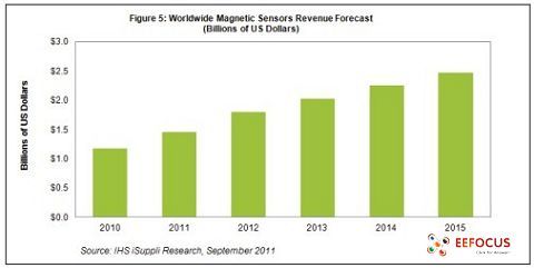 據IHS iSuppli公司的MEMS與傳感器專題報告,汽車產業恢復生機,全球智能手機和平板電腦對于數字羅盤的需求上升,正在推動硅磁傳感器市場加速增長,預計2011年銷售額將上升23.7%。