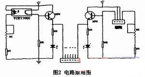 具體電路設計見圖2。以圖左半部分為例,當TCRT5000下面無黑線時,紅外線能正常反射,接收管可以接收到信號并導通,此時NPN三極管導通,指示燈亮并向單片機提供高電平。反之當光電傳感器下面有黑線時,NPN三極管關斷,單片機得到低電平信號。通過調節102的可調電阻,可以調整發射強度,下面100Ω電阻作為防燒毀的限流電阻。這是一張簡化的原理圖,圖中左半部的電路同樣可以視需要的尋跡器個數擴展任意多個。本設計用五只TRCT5000來尋跡,對應輸給單片機插口的7-3號腳,這樣可分別接避障模塊和路程檢測模塊。