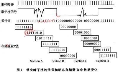從單片機(jī)計(jì)數(shù)輸入端,觀察信號(hào)波形。為便于分析,在高、低電平段設(shè)置了幾個(gè)干擾尖峰脈沖,分別標(biāo)示為Section A和Section C,占空比信號(hào)下降沿、上升沿分別標(biāo)示為Section B和Section D。單片機(jī)按計(jì)數(shù)時(shí)鐘周期性采樣,采樣值中“1”表示采到的是高電平,“0”表示低電平。I/O口采樣占空比信號(hào)輸出端口中狀態(tài),利用1個(gè)字節(jié)型變量R來(lái)動(dòng)態(tài)存儲(chǔ)采樣值。控制器每采樣1次,變量R中數(shù)據(jù)向左移1個(gè)二進(jìn)制位,R原最高位電平狀態(tài)被移除,而當(dāng)前時(shí)刻新的采樣狀態(tài)保存到R的最低位,變量R被更新了,狀態(tài)存儲(chǔ)器R中保存著最近8個(gè)采樣周期的采樣值。