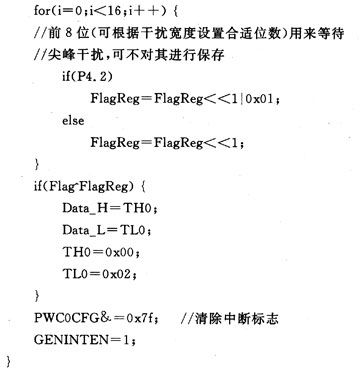 根據(jù)軟件濾波設(shè)計(jì)思想,濾波子程序由主程序在信號(hào)狀態(tài)發(fā)生變化,進(jìn)入中斷時(shí)調(diào)用,圖2給出了濾波程序流程。對(duì)照?qǐng)D1中4種Section來(lái)分析流程圖。當(dāng)有邊沿或干擾信號(hào)(信號(hào)周期大于計(jì)數(shù)時(shí)鐘周期)到來(lái)時(shí),VRS51L3074單片機(jī)的PWC計(jì)數(shù)停止條件滿足,系統(tǒng)進(jìn)入中斷服務(wù)子程序。在中斷子程序中,首先重置脈寬計(jì)數(shù)條件,然后對(duì)當(dāng)前狀態(tài)進(jìn)行采樣,采樣1次,狀態(tài)寄存器左移1位,采樣到高電平記為“1”,采樣到低電平記為“0”。如正常下降沿Section B,前面處于高電平段,初始狀態(tài)變量Flag全為1,當(dāng)出現(xiàn)低電平,控制器進(jìn)人中斷,緊接著進(jìn)行16次采樣。前已提及系統(tǒng)處理的尖峰干擾約1~2 ms,每個(gè)采樣周期約為0.4 ms,其尖峰干擾脈寬達(dá)不到8個(gè)采樣周期。系統(tǒng)設(shè)計(jì)時(shí)采樣16次,只取最后8次的存儲(chǔ)狀態(tài)與原狀態(tài)進(jìn)行比較,如果最后采樣的狀態(tài)全為“0”則與原狀態(tài)相反,就可判斷出這是1個(gè)正常下降沿。如果是干擾信號(hào)引起計(jì)數(shù)中斷,前面8個(gè)采樣狀態(tài)不全為“1”,后面8個(gè)狀態(tài)全為“1”,最后采樣的狀態(tài)與原狀態(tài)相同,就可判斷出這是1個(gè)干擾信號(hào),如Section A。在信號(hào)狀態(tài)采樣期間,計(jì)數(shù)條件滿足PWC繼續(xù)計(jì)數(shù),直到真正的下降沿到來(lái),計(jì)數(shù)停止并保存,計(jì)數(shù)寄存器還原為初始值,這樣干擾信號(hào)即被濾除。類似地,正常上升沿Section D,存儲(chǔ)器原狀態(tài)為“0”,上升沿來(lái)臨后存儲(chǔ)器狀態(tài)為“1”,與原狀態(tài)相反,PWC計(jì)數(shù)停止并保存,計(jì)數(shù)寄存器還原為初始值,退出中斷子程序。有干擾信號(hào)出現(xiàn)后采樣狀態(tài)與原狀態(tài)相同,干擾尖峰脈沖可被濾除。如果要使脈寬計(jì)數(shù)更精確,可判斷前8個(gè)采樣周期中系統(tǒng)不正常計(jì)數(shù)的周期,然后與最終計(jì)數(shù)周期相加即可。此時(shí),程序流程體現(xiàn)出軟件濾波功能。