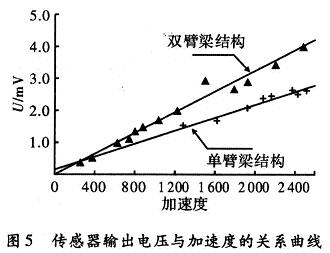 對制作的加速度傳感器樣品,在馬希特擊錘上進行了大量地沖擊標定測試,測試結果表明:設計和加工制作的加速度計樣品在進行加速度的沖擊時,有較好的信號輸出,單臂梁結構的加速度計的靈敏度為1 μV/gn;雙臂梁結構的加速度計的靈敏度為1.6μV/gn,與理論設計值基本吻合。