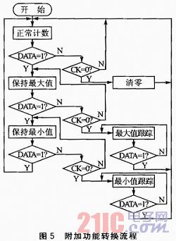 附加功能子程序包括正常計數、數據保持、最大值跟蹤、最小值跟蹤和清零的功能。對附加功能的實現均是通過控制CK和DATA信號線完成,附加功能轉換流程如圖5所示。給CK信號線一個負脈沖,即可完成清零操作;在正常計數狀態下將DATA信號線置為高電平,容柵傳感器將進入保數功能;如果再將CK信號線置為低電平,容柵傳感器進入最大值跟蹤功能;內部專用芯片將用新測得的數據與上一個數據進行比較,如果新測得數據大,則替換掉,否則丟棄。可以在上位機上通過USB測試軟件發送相關命令來控制系統進行操作。程序中設定一個字節的變量來存放從上位機接收到的命令,當判斷是其中的一個命令時就調用相應的處理程序完成操作。