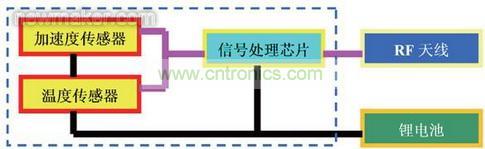 新一代DTPMS將MEMS的加速度傳感器和溫度傳感器與信號(hào)處理電路集成在一塊芯片中。傳感器模塊的構(gòu)成部件有集成MEMS傳感器和信號(hào)處理電路的胎壓監(jiān)測(cè)器芯片、電池以及向本車駕駛臺(tái)傳輸計(jì)測(cè)結(jié)果的天線這三個(gè)部分,如圖1所示。由此使得內(nèi)置傳感器模塊的重量大大降低,先前安裝在輪胎氣門嘴上的已有傳感器模塊重量原為1個(gè)37g,而新一代DTPMS粘貼在輪胎上的模塊重量?jī)H為11g。其電池壽命可達(dá)到與輪胎一樣的6年。