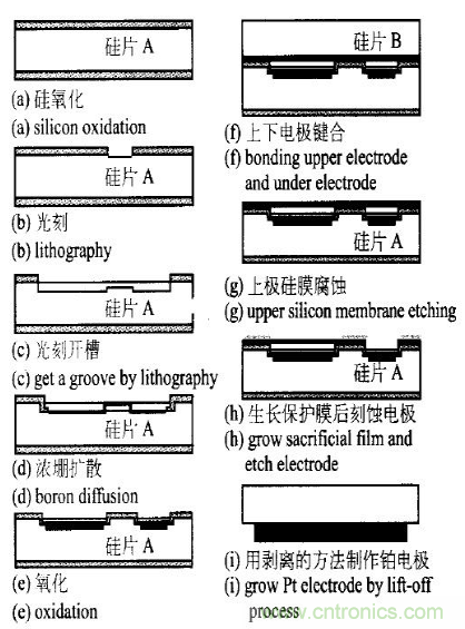 硅電容式壓力傳感器的敏感元件是半導體薄膜,它可以由單晶硅、多晶硅等利用半導體工藝制作而成。典型的電容式傳感器由上下電極、絕緣體和襯底構成。當薄膜受壓力作用時,薄膜會發生一定的變形,因此,上下電極之間的距離發生一定的變化,從而使電容發生變化。但電容式壓力傳感器的電容與上下電極之間的距離的關系是非線性關系,因此,要用具有補償功能的測量電路對輸出電容進行非線性補償。由于高溫壓力傳感器工作在高溫環境下,補償電路會受到環境溫度的影響,從而產生較大的誤差。基于模型識別的高溫壓力傳感器,正是為了避免補償電路在高溫環境下工作產生較大誤差而設計的,其設計方案是把傳感器件與放大電路分離,通過模型識別來得到所測環境的壓力。高溫工作區溫度可達350 ℃。傳感器件由鉑電阻和電容式壓力傳感器構成。其MEMS 工藝如下: