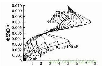 對于半橋時電路II由于希望鐵芯在最下方時回路II諧振,最上方時回路I諧振,因為L1和L2的變化范圍為3~7 mH。L2為7 mH時回路II諧振,L1為7 mH時回路I諧振。按照仿真條件計算C1=C2=65 nF。簡化仿真不妨取C1=C2,在65 nF附近從55~100 nF間隔5 nF進行仿真,觀察電路性能,仿真結果如圖2所示。