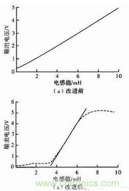 經Matlab計算普通半橋在3~7 mH段,電壓變化范圍1.5~3.5 V,電壓對電感的靈敏度為0.5V/mH。線性度近似為1。對圖3(b)采用最小二乘法擬合直線后,在3.8~6.3 mH段,輸出電壓的變化范圍0.77~4.39 V。線性度可達2.39%,靈敏度為1.448 V/mH。