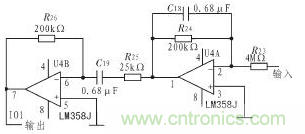 0.7 Hz的高通濾波器用來檢測心跳信號,這里采用2個二階壓控高通濾波器串聯(lián)形成的四階高通濾波器來構(gòu)成O.7Hz高通濾波器,其電路如圖6所示。