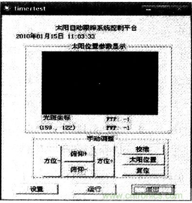 上位機可執行程序控制界面如圖5所示,上位機控制平臺具有實現復位,太陽位置的跟蹤、手動校準。其中“設置”按鈕,可進行波特率、調整時間間隔等的設置。