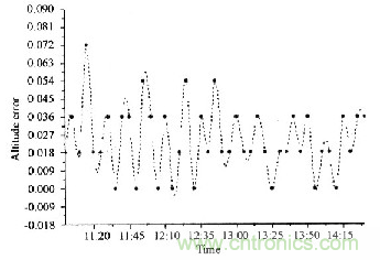 圖6和圖7給出了太陽高度角和方位角的誤差曲線。由曲線看出,采用基于圖像傳感器的太陽自動跟蹤控制器后絕對誤差較小且保持相對穩定。通過對實測數據的分析表明:在該系統中,高度角跟蹤絕對誤差小于0.12°,方位角跟蹤絕對誤差小于0.08°,采用圖像傳感器對太陽進行跟蹤后,得到了很高的精度,且可靠性提高。