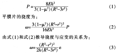 計算時假設(shè):小撓度理論;壓力是均勻作用于平膜片表面。由平膜片的應(yīng)力計算公式可知: