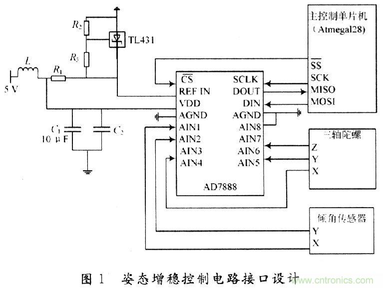 無(wú)人機(jī)內(nèi)回路控制作為外回路控制的基礎(chǔ),對(duì)其能否穩(wěn)定飛行起著至關(guān)重要的作用。該系統(tǒng)中,內(nèi)回路是由三軸陀螺和傾角傳感器構(gòu)成的姿態(tài)增穩(wěn)控制回路。主要由主控制單片機(jī)、A/D采樣芯片、三軸陀螺儀和傾角傳感器組成。主控制單片機(jī)通過(guò)SPI串行總線與A/D采樣芯片相連,通過(guò)A/D采樣芯片獲得三軸陀螺儀的角速率與傾角傳感器的橫滾角和俯仰角,然后進(jìn)行姿態(tài)信息融合,得到無(wú)人機(jī)俯仰和橫滾的姿態(tài)信息。主要接口連接情況如圖1所示。