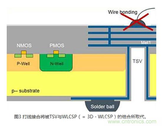 模擬3DIC技術通常是透過建造芯片正面到IC背面的電氣連接來實現傳感器應用。 在許多傳感器應用,例如光學、化學、氣體或壓力傳感器中,感測區域是位在CMOS側(晶圓的頂端)。 芯片和導線架之間最常用的連接是打線接合(Wire bonding)(圖1)。 無論是使用塑料封裝,或是將裸片直接接合在印刷電路(PCB)或軟性電路板上,對于某些會將感測區域暴露出來的應用而言,打線接合并非理想的解決方案。 采用專業晶圓代工業者的專有TSV技術,可以利用TSV、背面RDL和芯片級封裝(WLCSP)(圖2)來替代打線。