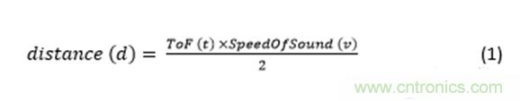 距離(d)是從無人機上的超聲波傳感器到地面/物體的距離,ToF(t)是前面定義的ToF,而SpeedOfSound(v)是通過介質的聲速。ToF(t)×SpeedOfSound(v)除以2,因為ToF計算超聲回波往返物體的時間。