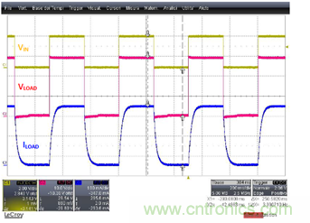 圖7所示是充電波形(綠線代表Vin;紅線代表Vload;藍(lán)線代表Iload)。
