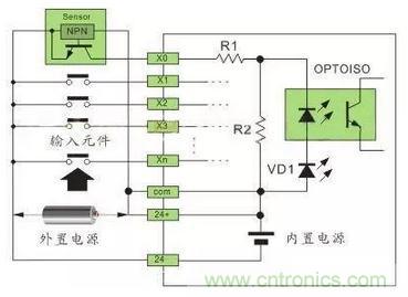 注:24VDC供電的傳感器,在輸入回路上需要串聯限流電阻,R1為10Ω,R2為2KΩ,不串聯限流電阻,將燒毀接口回路,限流電阻取值2.7KΩ。