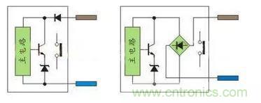 直流兩線制接近開關分二極管極性保護與橋整流極性保護,前者在接PLC時需要注意極性,后者就不需要注意極性。有源舌簧磁性開關主要用在汽缸上做位置檢測,由于需要信號指示,內部有雙向二極管回路,因此也不需要注意極性;交流兩線制接近開關就不需要注意極性。如圖10: