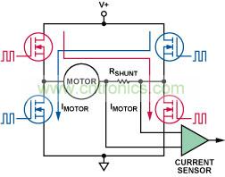 在使用單一控制FET的電磁閥控制(圖1)中,電流始終沿同一方向流動,因此單向電流檢測器就足夠了。在電機控制配置(圖2與圖3)中,電機相位進行分流意味著取樣電阻中的電流沿著兩個方向流動,因此,需要雙向電流檢測器。