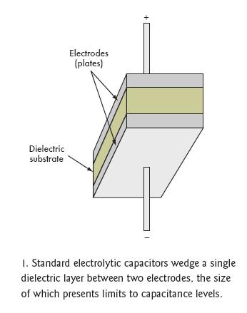 [page]標準電容的結構是在兩個附屬于金屬板上的電極之間夾一層電介質層(圖1)。根據電容類型不同,電介質可以是氧化鋁、四氧化鉭、氧化鈦鋇或聚丙烯聚酯,不同的材料決定了不同的容量和電壓特性(圖2)。電介質的多少和極板間的距離也會影響電容量。然而,極板間最大允許距離限制了電介質的數量。