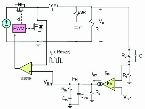 通過前面的討論可知,在每個(gè)開關(guān)周期,低端的開關(guān)管流過的電流波形為下降階段的梯形波。這種電流模式常稱為谷點(diǎn)電流模式。和峰值電流模式一樣,谷點(diǎn)電流模式反饋也有兩個(gè)環(huán)路:一個(gè)電壓外環(huán),另一個(gè)是電流內(nèi)環(huán)(見圖2)。
