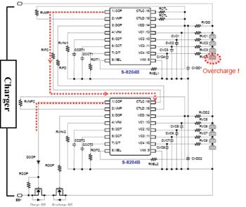 下面,詳細介紹一下保護芯片級聯(lián)的具體工作情況。還是以S-8204B為例,其CTLC端子可由芯片外部控制COP端子的輸出電壓、而CTLD端子則可由芯片外部控制DOP端子的輸出電壓。通過CTLC端子以及CTLD端子可以分別單獨控制COP端子與DOP端子的輸出電壓。并且,這些控制功能優(yōu)先于芯片內(nèi)部的電池充放電保護功能。如果8節(jié)電池中的某一節(jié)電池發(fā)生過充,與該電池相連接的S-8204B的COP端子輸出電壓會發(fā)生變化,該電壓變化會傳遞到與其相連接的另一個S-8204B的CTLC端子,使得另一個S-8204B的COP端子輸出電壓也發(fā)生變化,從而控制充電控制用MOSFET關(guān)斷,實現(xiàn)鋰離子電池的過充電保護。