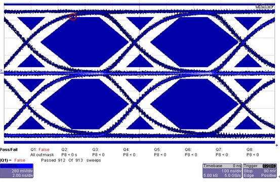 經過研發與測試工程師的討論,在目前不改動系統設計的前提下,采用微調RDAC電阻的方法來增大信號輸出電平幅度以解決信號眼圖的問題。經過調整后,眼圖測試通過,波形見圖6。