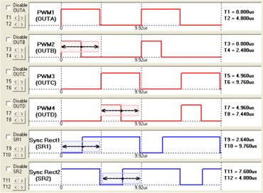 因此,為最大限度地提高效率,要求死區(qū)時(shí)間盡可能小。但是在傳統(tǒng)的模擬方案中,自驅(qū)動(dòng)型除了應(yīng)用的限制外,還很難提供精確的控制時(shí)序;對(duì)于外驅(qū)動(dòng)型,由于其參數(shù)是由電阻、電容等無源器件進(jìn)行設(shè)定,存在誤差、老化、溫漂等問題,為保證有足夠的余量,死區(qū)時(shí)間也不可能設(shè)置得很小。因此,ADP1043的數(shù)字方案是很好的選擇。圖2所示為ADP1043在全橋拓?fù)潆娐废碌腜WM和SR的GUI設(shè)置界面。通過設(shè)置T9、T10、T11和T125便可精確獲得同步整流MOSFET所需的死區(qū)時(shí)間,其中每次調(diào)整的最小時(shí)間為5ns。