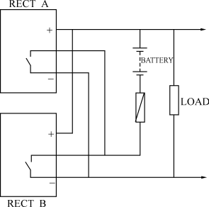 一個使電源系統簡化的新功能是整流器內置低壓斷開裝置。這一功能會在市電斷電一段時間后電池電壓低于閾值時發揮作用,這就防止了電池的永久性損壞。如果是大量模塊并聯的系統,在每個模塊內置低壓斷開裝置很不實際;這時選用系統解決辦法更合適。在較小的系統即2個模塊并聯(1+1),每個模塊都內置一個低壓斷開裝置很理想。這會使系統特別簡易,只有兩個整流器,一個電池和一個電池保險。圖3是系統框圖。