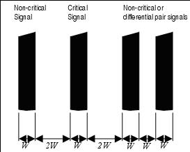 布線分離的作用是將PCB同一層內相鄰線路之間的串擾和噪聲耦合最小化。3W規范表明所有的信號(時鐘,視頻,音頻,復位等等)都必須象圖10所示那樣,在線與線,邊沿到邊沿間予以隔離。為了進一步的減小磁耦合,將基準地布放在關鍵信號附近以隔離其他信號線上產生的耦合噪聲。
