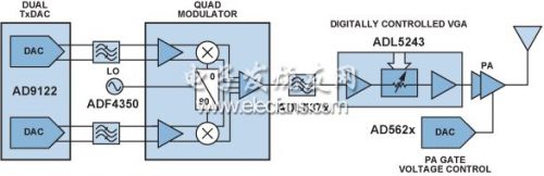 圖5顯示了超外差式或ZIF發射機,該器件采用以下元件:TxDACAD9122、低通濾波器、正交調制器ADL537x、另一個RF濾波器、頻率合成器ADF4350、數字控制VGAADL5243、功率放大器、用于控制功率放大器(PA)柵極電壓的DACAD562x.