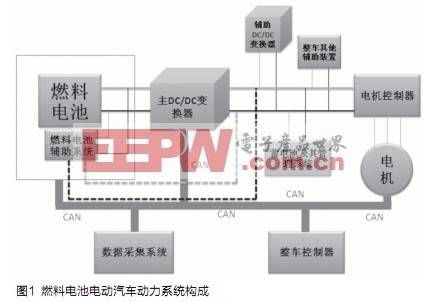 目前,燃料電池電動汽車(FCEV)成為我國汽車科技創新主攻方向。燃料電池電動汽車動力系統主要由燃料電池發動機,DC/DC變換器,蓄電池,電機控制器(變頻器)及電機,整車控制器,數據采集系統及CAN總線組成,如圖1所示。其中DC/DC變換器可以對燃料電池的輸出進行控制及能量的傳遞與轉換,成為燃料電池電動汽車關鍵零部件之一。在燃料電池電動汽車運行過程中,DC/DC變換器所處的電磁環境十分復雜,各種形式的電磁干擾很多,嚴重影響了DC/DC變換器的正常運行。因此,研究FCEV用DC/DC變換器的電磁兼容性對DC/DC變換器乃至燃料電池電動汽車的可靠運行具有重要意義。