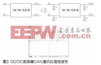 FCEV用大功率DC/DC變換器產生的電磁干擾以傳導干擾為主。目前最常用的方法就是在DC/DC變換器輸入和輸出端加裝濾波電容器。如圖3,為了減小FCEV用大功率DC/DC變換器對CAN通訊的干擾,在變換器輸入輸出端加適量的接地電容,CAN通訊波形得到有效改善。