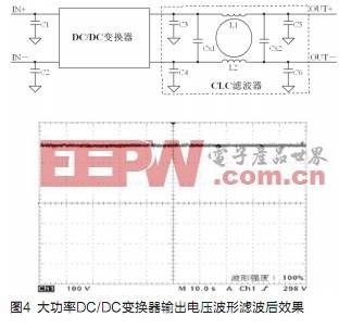 在FCEV用大功率DC/DC變換器中,輸出電壓或電流紋波是電源的重要指標。圖4在大功率DC/DC變換器的輸出端連接CLC濾波器后,變換器輸出電壓波形平穩,開關噪音減小,濾波效果十分明顯。