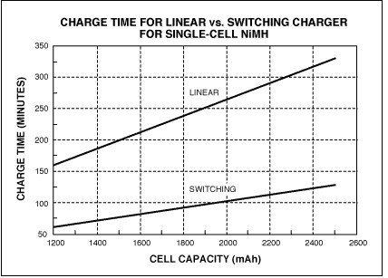 圖6. 對單節(jié)NiMH電池充電時,線性充電器和開關(guān)充電器的充電時間不同