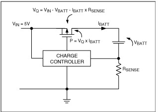 USB 2.0規(guī)范允許低功率端口提供最大100mA電流,大功率端口提供最大500mA電流。如果采用線性調(diào)整器件來調(diào)節(jié)電池充電電流,這也就是最大可提供的充電電流。線性調(diào)整器件(圖4)的功耗為P = VQ x IBATT。這會造成調(diào)整管發(fā)熱,可能需要安裝散熱器,以防止過熱。