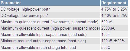 在符合USB 2.0規(guī)范的主機(jī)中,大功率端口的上游端具有120uF、低ESR電容。所連接的USB設(shè)備的輸入電容限制在10?F以內(nèi),在最初的負(fù)載連接階段,允許負(fù)載從主機(jī)(或自供電集線器)吸取的最大電荷數(shù)為50?C。這樣一來,當(dāng)新設(shè)備連接至USB端口時,上游端口的瞬態(tài)電壓跌落小于0.5V。如果負(fù)載正常工作時需要更大的輸入電容,則必須提供浪涌電流限制器,以保證對更大的電容充電時電流不會超過100mA。