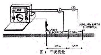 該功能在測(cè)量接地電阻時(shí)自動(dòng)執(zhí)行,如果超過設(shè)定的極限值,將顯示干擾電壓過高,此時(shí)自動(dòng)禁止測(cè)量接地電阻,干擾頻率只有在干擾電壓超過1V時(shí)才能夠測(cè)量出來。旋轉(zhuǎn)開關(guān)選擇正確的測(cè)量檔,按鍵“3”即顯示干擾電壓和干擾頻率。