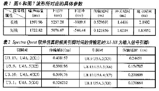 檢測器的每個信號應盡可能保持同一傳輸延遲,這就要求布線時盡量保持長度一致,對于微弱的差別,可以根據仿真結果延長或縮短布線。完成布線以后,再利用Spectra Quest軟件仿真輸入信號的傳輸延遲,具體參數如表2所示。可以看出,其相對延時不超過0.2ns,仿真結果比較理想。