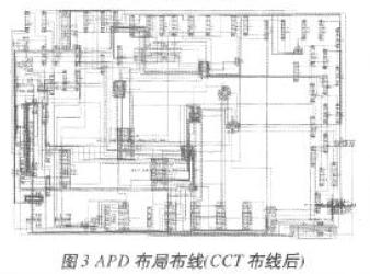 如上所述,MCM布局布線的實現包括電路原理圖生成、擴充零件庫及最終的布局布線完成和加工數據文件輸出。APD Layout包括Padstack(*.pad)、Package Symbol(*.psm)、Mechanical Symbol(*.bsm)、Format Symbol (*.osm)和Shape Symbol(*.ssm)五種,MCM布局布線設計中,所有的布局都必須有正確的Library Packing。MCM設計軟件自帶封裝庫往往不能滿足具體設計要求,只有擴充零件庫后,才能直接調用零件進行布局布線設計及最終的工藝文件輸出。首先利用Padstack Editor軟件擴充零件庫,然后對電路進行封裝,并通過Concept HDL給APD軟件導出電連接網表文件,最后完成電路布局布線。以檢測器電路為例,其原理圖主要部分如圖2所示,圖3為CCT(Spectra)布線后的形式。整個設計中,定義了16個Padstack和81個封裝符號,進行251次調用Padstack和89次調用功能單元,其中共用到了251個元件封裝符號引腳和229個功能單元引腳。