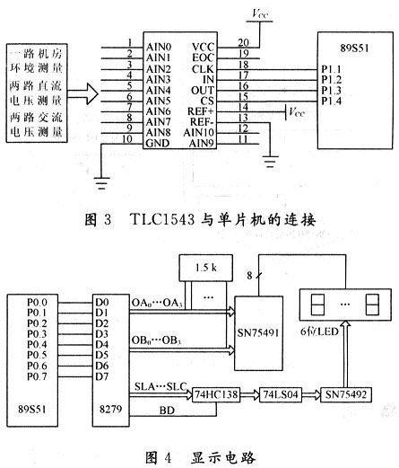 直流電壓、交流電壓以及機房溫濕度的測量選用TLC1543,TLC1543為10位11通道的A/D轉(zhuǎn)換器,與單片機的連接如圖3所示。機房環(huán)境測量(溫度、濕度)采用JWS溫濕度變送器,輸出信號為標(biāo)準(zhǔn)0~5V直流電壓信號;直流電壓的數(shù)據(jù)采集經(jīng)電阻分壓后直接送至A/D轉(zhuǎn)換器,交流電壓的采集經(jīng)分壓整流后也直接送至A/D轉(zhuǎn)換器。