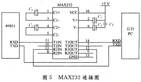 為了滿足數(shù)據(jù)傳輸距離大于200m,通信采用75LBC180全雙工485芯片,單片機通信電平和計算機電平的轉(zhuǎn)換采用MAX232完成,如圖5所示。MAX232芯片是專為電腦的RS232標(biāo)準(zhǔn)串口設(shè)計的接口電路,使用+5V單電源供電。另外。RS232到RS485的轉(zhuǎn)換可采用專用的轉(zhuǎn)換器,如BOK-60或ATC-160A無源轉(zhuǎn)換器。