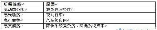 考慮到夜間行車,有些道路沒有路燈或者路燈很暗,汽車視覺系統(tǒng)也需要在低光照場景下采集路況信息。針對汽車應(yīng)用,圖像傳感器需要滿足一系列汽車級要求,如寬溫度范圍、高可靠性、高集成度、低成本等。表1總結(jié)了汽車視覺系統(tǒng)中圖像傳感器應(yīng)該具有的性能:
