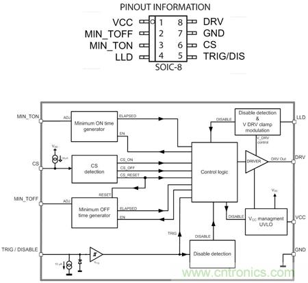 NCP4305可采用SOIC-8、DFN8和WDFN8三種封裝。MIN_TOFF 和MIN_TON引腳通過連接電阻到地,調(diào)節(jié)最小關(guān)斷和最小導(dǎo)通時(shí)間。LLD引腳用于在輕載時(shí)調(diào)節(jié)驅(qū)動器鉗位電平,或關(guān)斷驅(qū)動器。DRV引腳是同步整流MOSFET的驅(qū)動器輸出。CS(電流采樣檢測)引腳用于檢測電流是否流過同步整流MOSFET。TRIG/DIS引腳提供超快關(guān)斷輸入,用作在CCM應(yīng)用中關(guān)斷同步整流MOSFET以提升能效,當(dāng)上拉超過100 us時(shí)激活禁用模式。